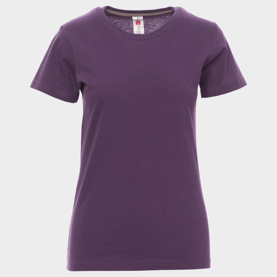 Дамска тениска с къс ръкав и обло деколте. Контрастираща лента за укрепване от рамо до рамо, видима от вътрешната страна на яката. Еластични шевове.
