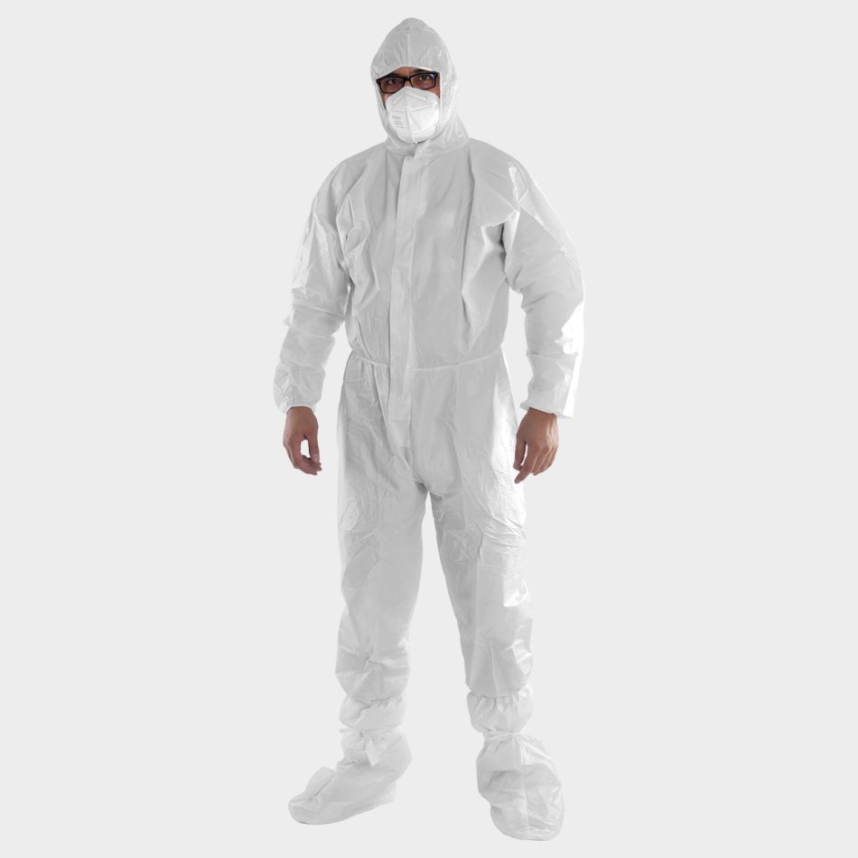 Прахозащитен гащеризон с качулка за еднократна употреба, ламиниран с микропорест филм, антистатичен. Защитава от химикали, радиоактивни и заразни частици. Кат. СЕ III, тип 5, 6.