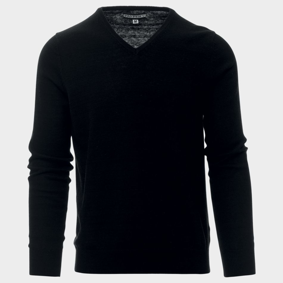 Мъжки пуловер с V-образно рипсено деколте. Маншети и ластик изработени от фин сатен и съединяване на отделните части безшевно.