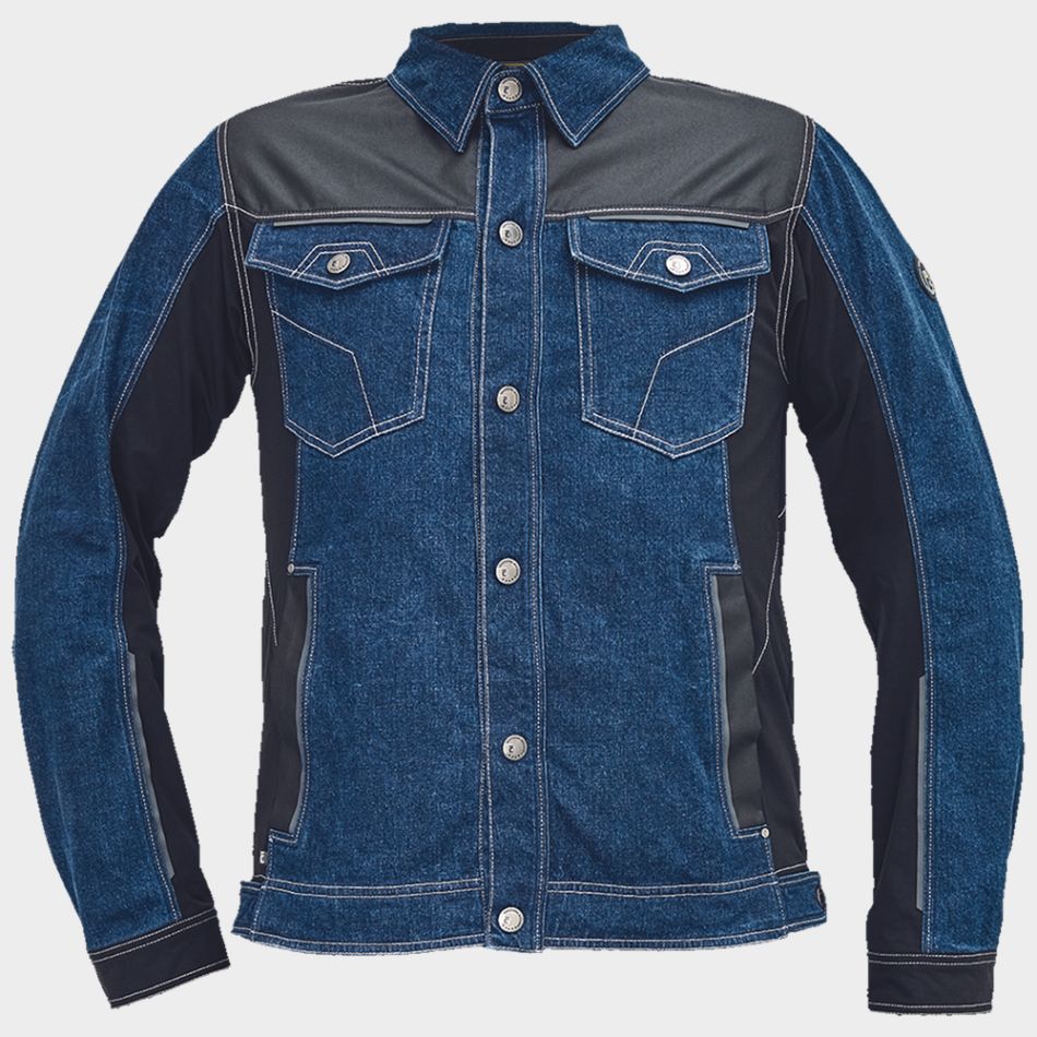 Mъжко работно яке от промазан дънков плат с тик так закопчаване. В комбинацията от полиамиден материал TRIFIBETEX PRO предоставя еластичност във всички посоки. Подсилени части с CORDURA в раменете. 2 странични джоба, 2 нагръдни джоба с тик так закопчване.