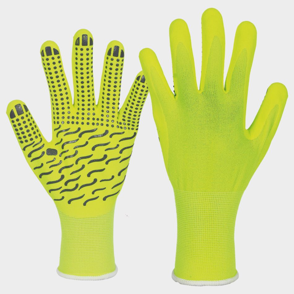 Ръкавици с пет пръста от 15G полиестер/ ликра, в сигналнозелен цвят, топени в жълт микропорест нитрил, с полимерни капки на дланите за по-добър захват при суха, мокра и мазна среда.