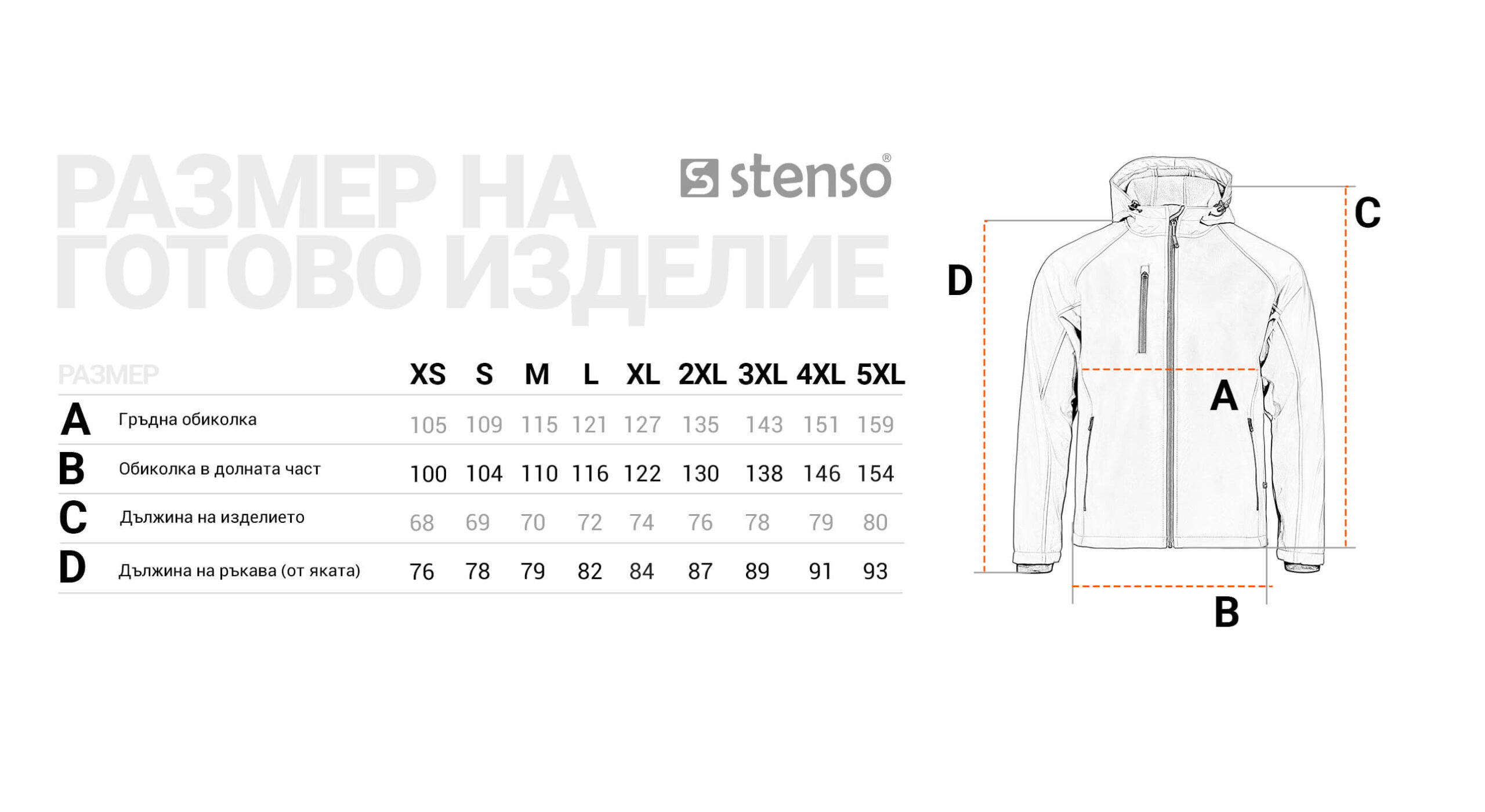 Материал: 150D полиестер механично стречиран + TPU мембрана + полар, 300 гр./м², 8000 мм воден стълб, 200 mvp въздухопропускливост.