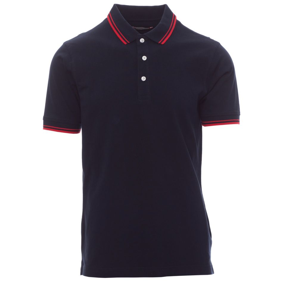 Мъжка поло тениска с къс ръкав и яка, закопчаване с три бели копчета. Странични цепки с подсилени шевове. Контрастни ленти за ластичните маншети и яката. Подсилени еластични шевове. Подсилваща лента от вътрешната страна на яката.