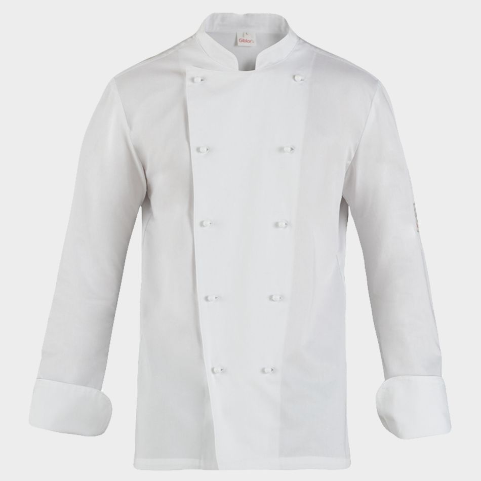 Туника за готвач с дълъг ръкав, джоб за химикал на ръкава, закопчаване с подвижни копчета, вталена кройка.